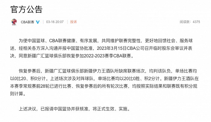 3月16日,CBA联赛官微发文称,为使中国篮球、CBA联赛健康、有序发展,共同维护联赛完整性,更好地回馈社会、服务球迷,经相关各方深入沟通