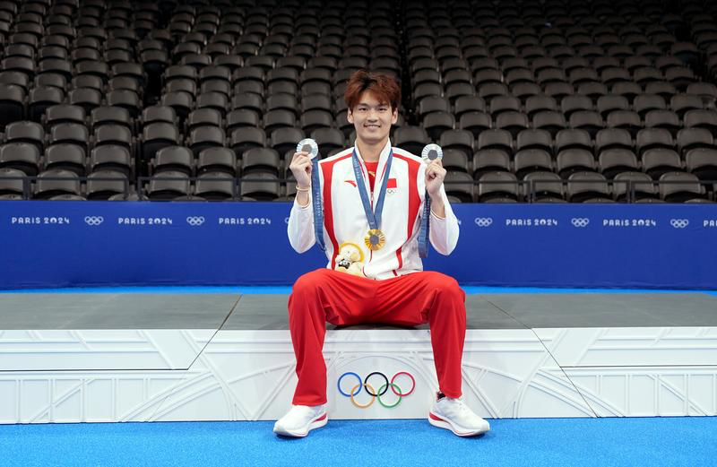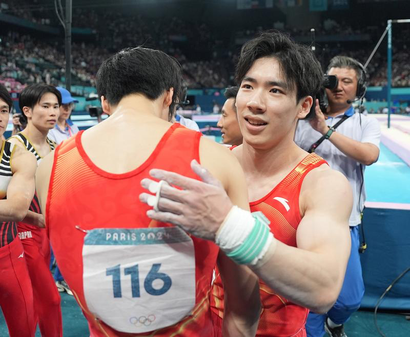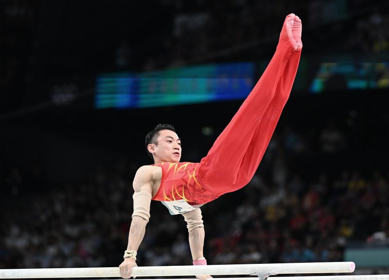 8月5日,中国选手邹敬园在比赛中。当日,在巴黎奥运会体操男子双杠决赛中,中国选手邹敬园获得冠军。