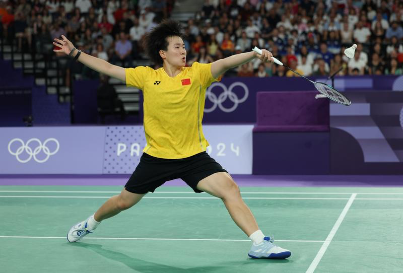 8月5日,中国选手何冰娇在比赛中。当日,在巴黎奥运会羽毛球项目女单决赛中,中国选手何冰娇0比2不敌韩国选手安洗莹,获得银牌。