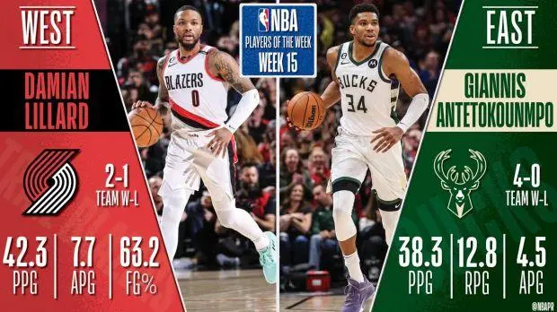 1月31日,NBA官方公布了常规赛第15周的周最佳球员,开拓者当家球星达米安-利拉德当选西部周最佳,雄鹿当家球星扬尼斯-安泰托昆博当选东部周