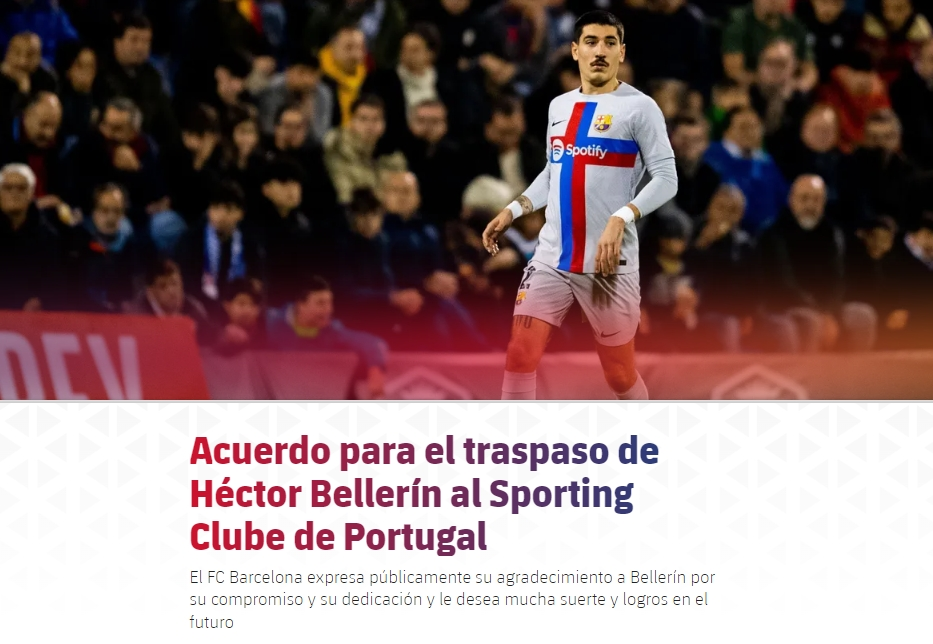 葡萄牙体育俱乐部31日宣布从西甲巴塞罗那队签下西班牙右后卫贝莱林。27岁的贝莱林在2022年夏天以自由球员的身份加盟巴萨,但本赛季至今仅获