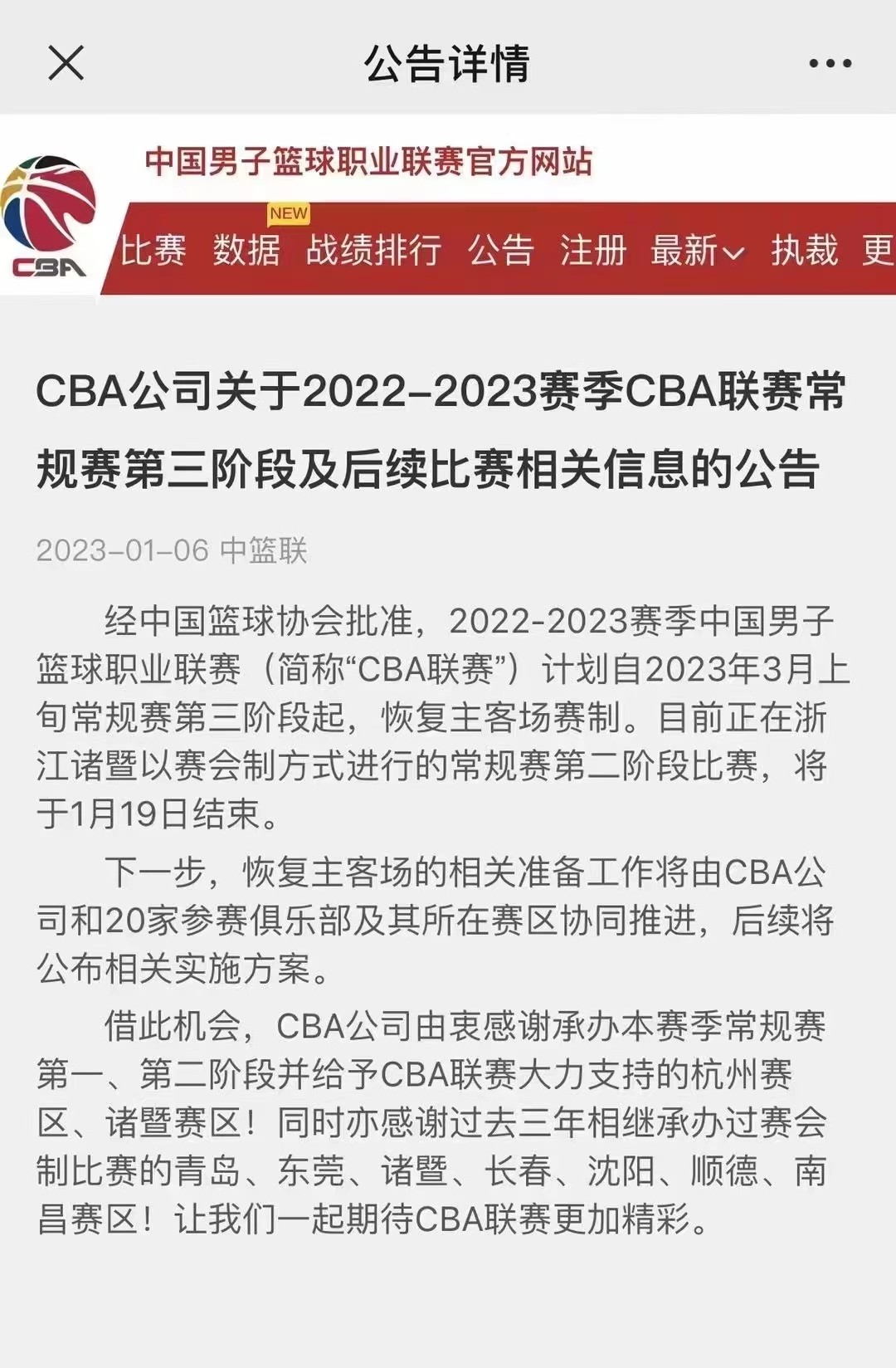 1月6日,中国篮协官方宣布,将于2023年3月上旬常规赛第三阶段起,恢复主客场赛制。相关准备工作将由CBA公司、参赛俱乐部及其所在赛区三方共