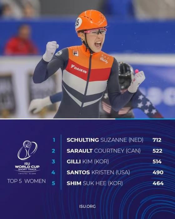 当地时间21日,国际滑联公布了四站短道速滑世界杯赛事后的水晶球积分榜。荷兰名将舒尔廷和韩国选手朴智元分别暂列女子、男子排行榜第一位。