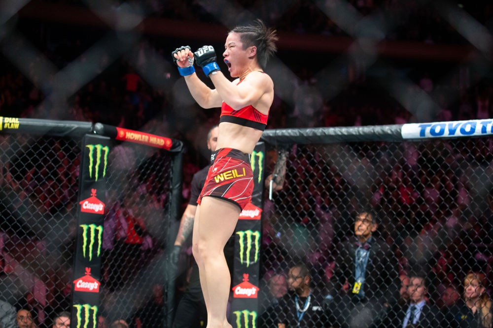 12日,终极格斗冠军赛UFC281在纽约麦迪逊花园广场拉开战幕。中国选手张伟丽裸绞终结女子草量级现任冠军卡拉·埃斯帕扎,重夺金腰带。 比