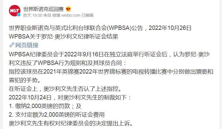 据世界斯诺克巡回赛(WST)官方微博消息,WPBSA纪律委员会于2022年9月16日在独立法庭举行听证会后,认为罗尼•奥沙利文违反了WPBSA行为规