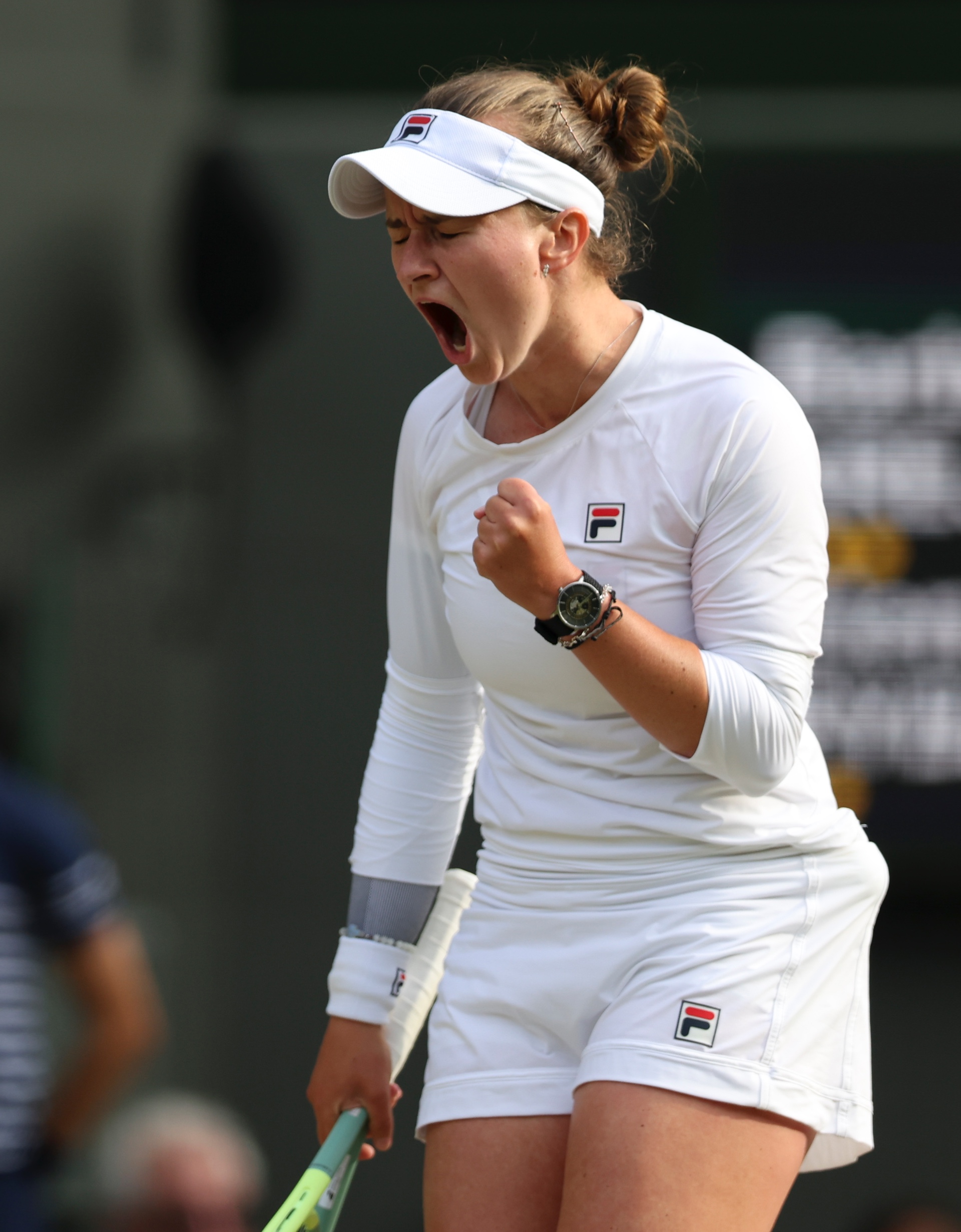 2024-07-127月11日,克赖奇科娃在比赛中庆祝得分。当日,在英国伦敦举行的2024温布尔登网球公开赛女子单打半决赛中,捷克选手克赖奇科娃2比1战胜哈萨