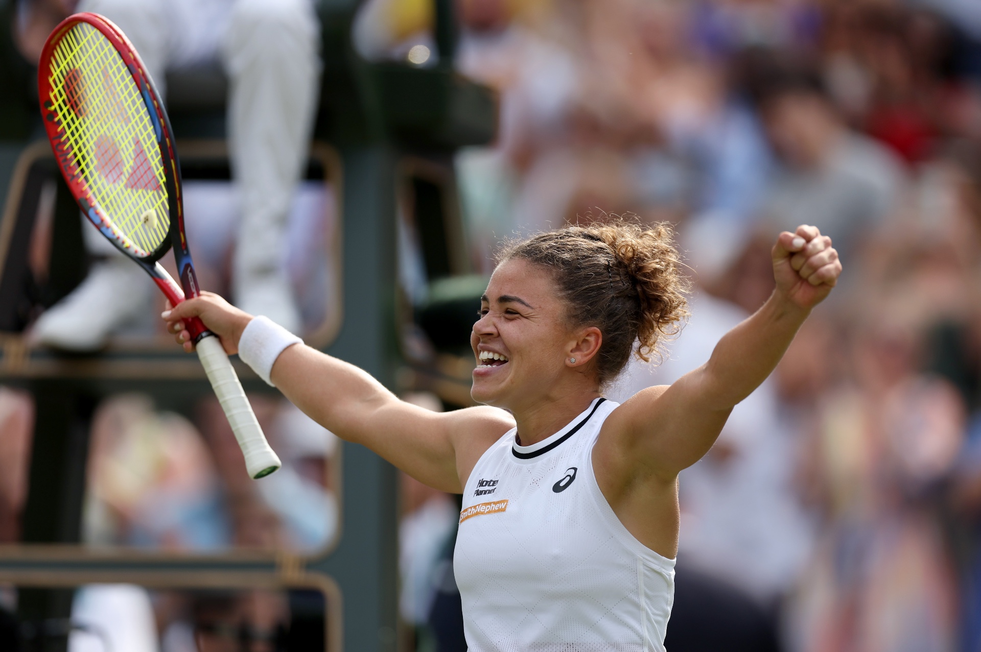 2024-07-127月11日,保利尼在比赛后庆祝胜利。 当日,在英国伦敦举行的2024温布尔登网球公开赛女单半决赛中,意大利选手保利尼2比1战胜克罗地亚选