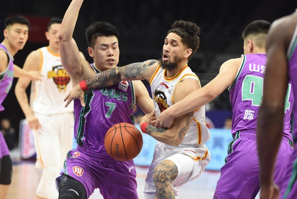 深圳马可波罗队球员布克(右一)在比赛中带球突破 新华社发