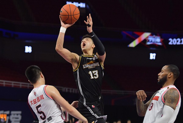 4月16日,辽宁本钢队球员郭艾伦(中)在比赛中投篮 新华社发