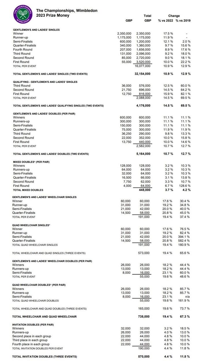 2023年度温网奖金具体分配如下图: